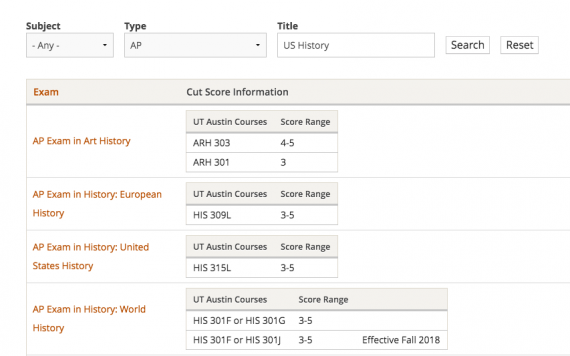 I ran an experiment for myself to learn the specifics at one particular college – The University of Texas at Austin. I went to their website (which you can do too here) and looked up AP U.S. History as an example exam. At UT Austin, if you get a 3 or above on that exam you can get credit for HIS 315L, a semester-long introductory U.S. history course.