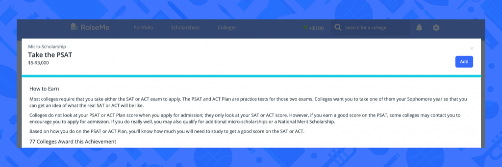 Now that you’ve taken the exam, you are eligible for the National Merit Scholarship program — an academic competition for college scholarships and recognition. This program You can also earn micro-scholarships on Raise Me! Log in to your account to earn micro-scholarships from partner colleges for just taking the exam, and to see if you qualify for more micro-scholarships from scoring well on it.